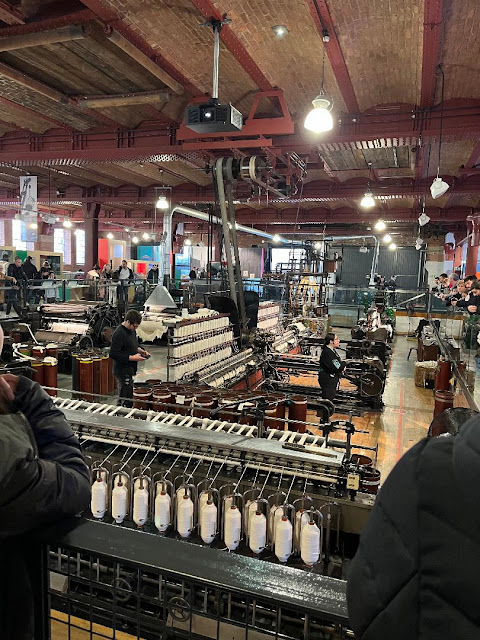 It is split over two levels and a ramp connects the upper & lower levels. Working textile machines are located in the upper level. These historic machines are demonstrated and the visitors can watch from the platform level. There is a glass safety barrier.